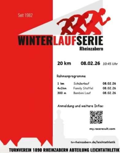 Am kommenden Sonntag, den 08.02.2026 lädt die Abteilung Leichtathletik des Turnvereins Rheinzaberns zum Finale der 42. Winterlaufserie ein. Über 900 Voranmeldungen sind bereits beim Veranstalter eingegangen. Aufgrund der geänderten Fahrpläne der deutschen Bahn wird der Lauf erst um 10:45 Uhr gestartet.
